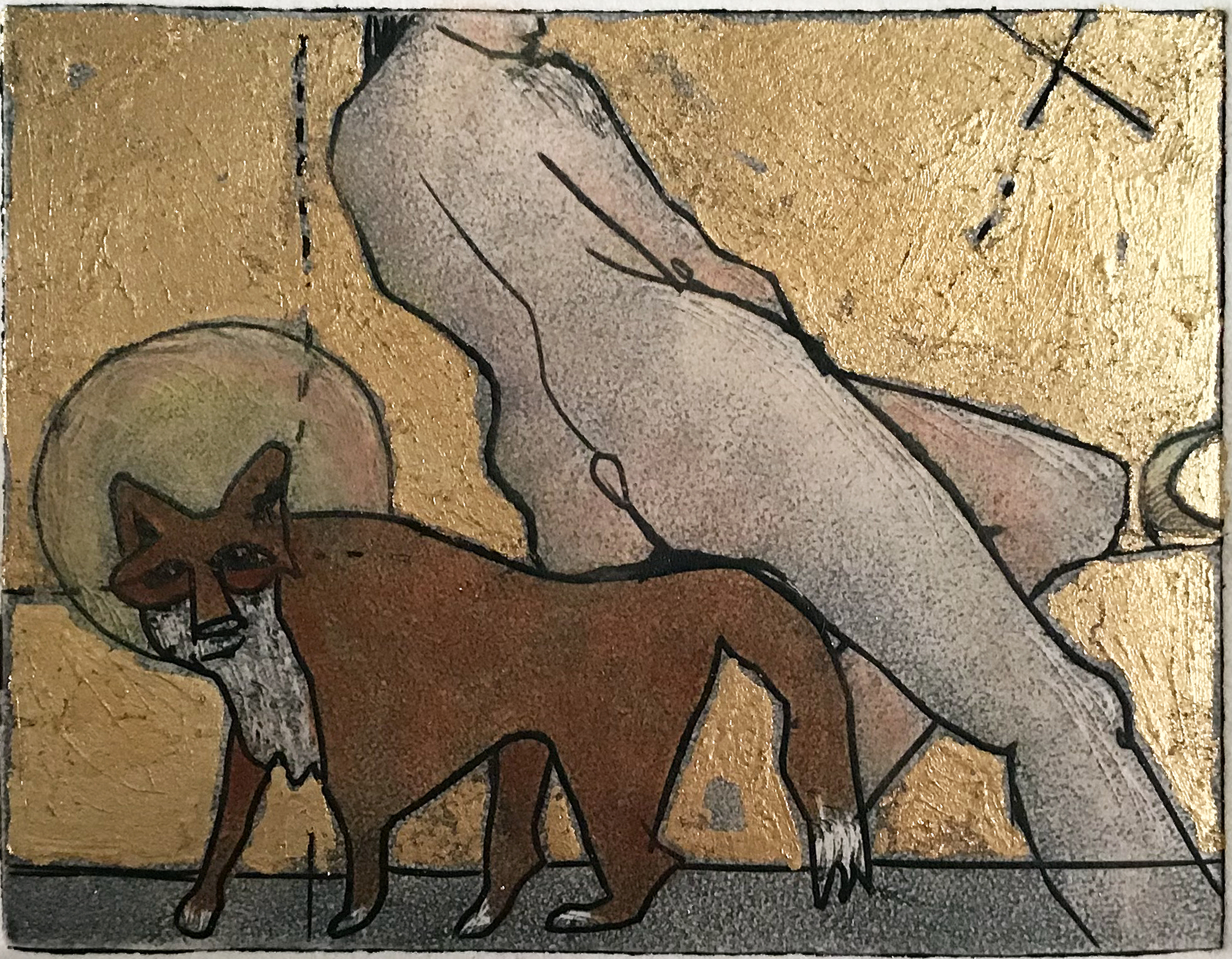 linocut intaglio print with hand finished acrylic wash and gold leaf 3.5 x 4.5″” $125.00 in 8×10″ mat 150.00 framed