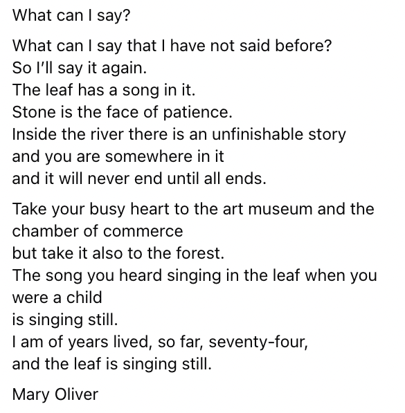 “The leaf has a song in it” is a line from a poem by Mary Oliver.