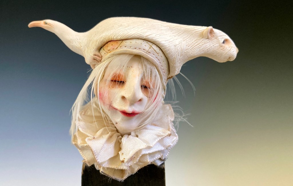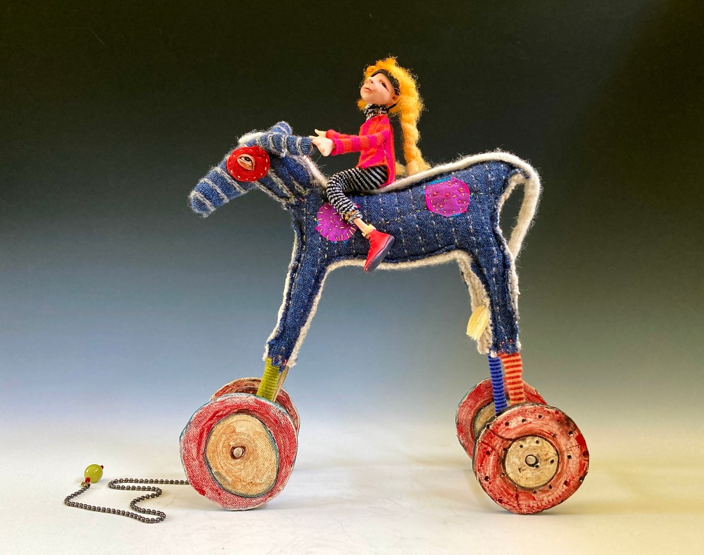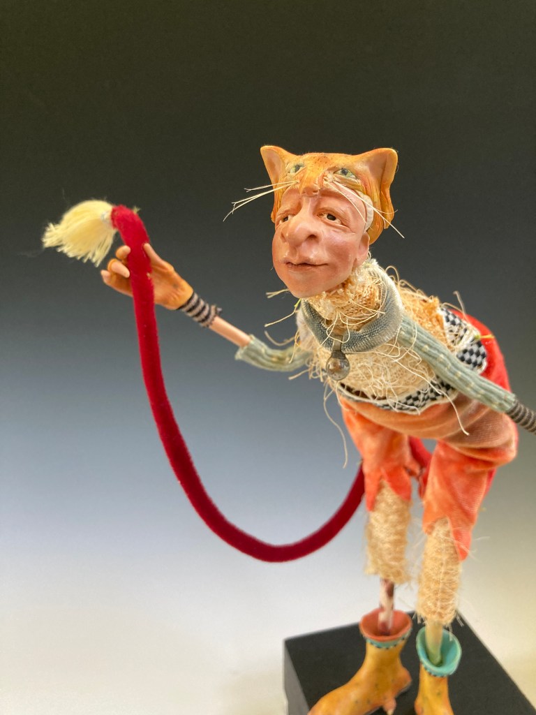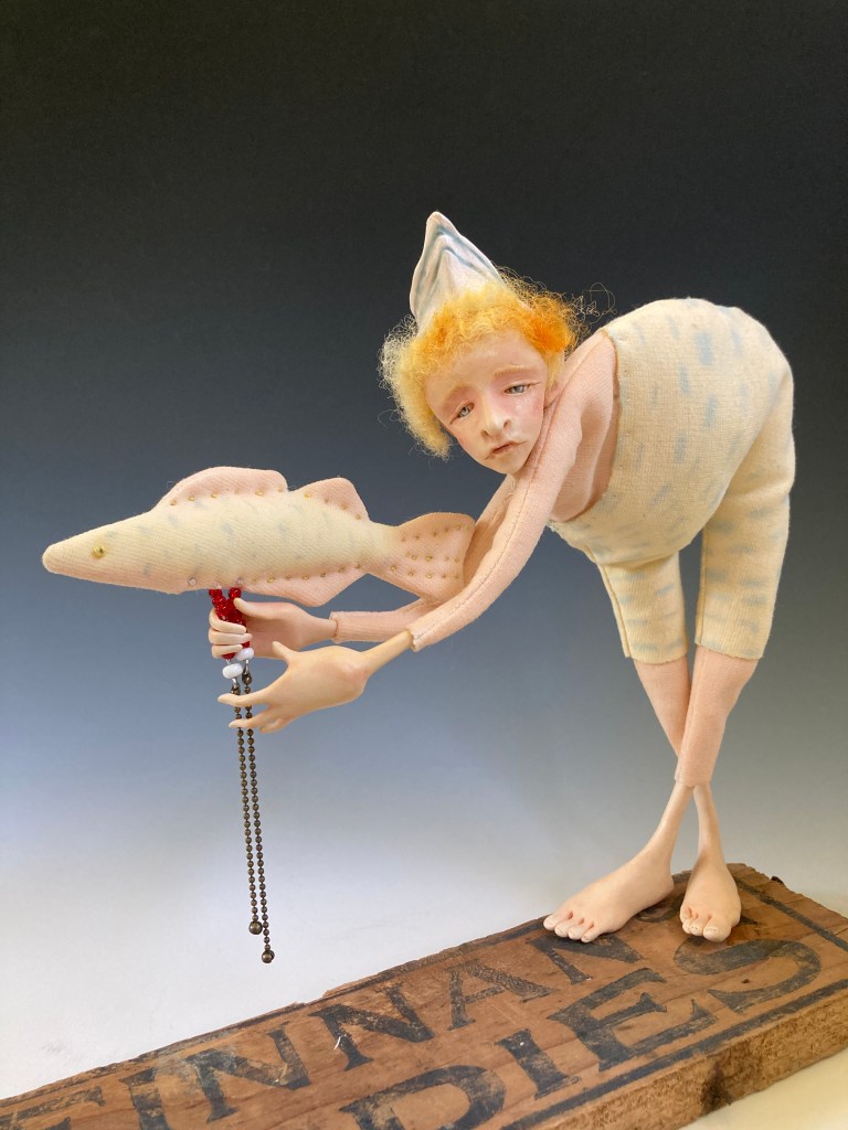 My figurative work is a combination of different materials and methods. I use polymer clay which I colour with pigments and inks. The bodies are built using wire armature then covered or dressed with cloth which may also be at times painted. The bases are found objects or wooden forms I have designed and painted.