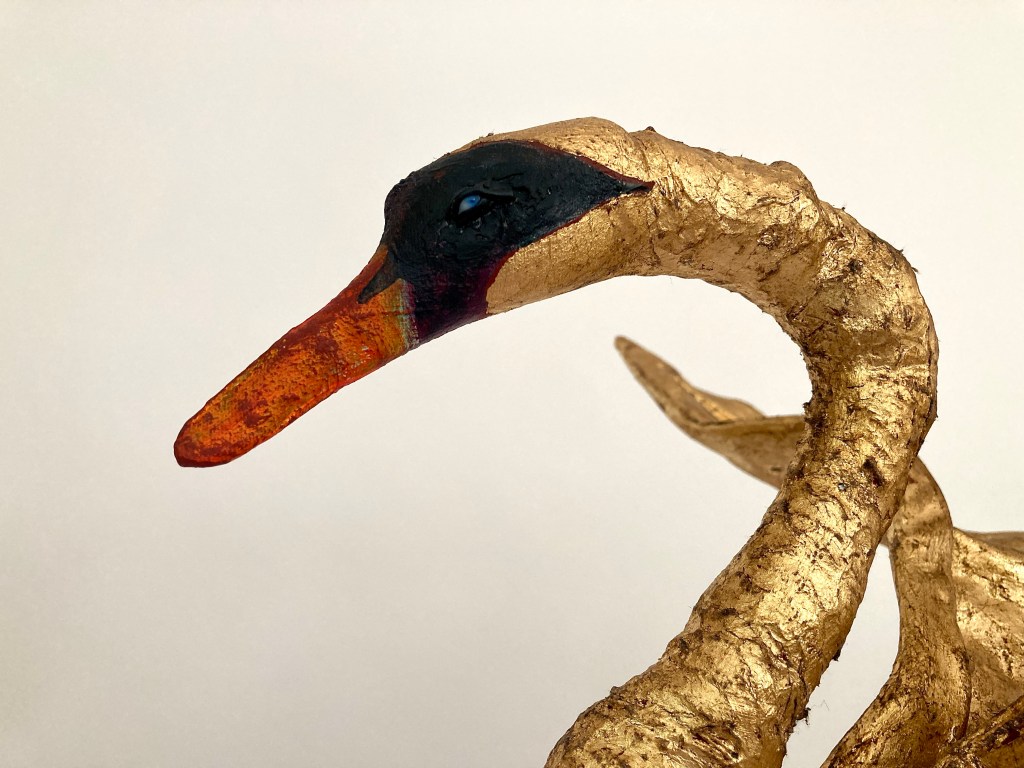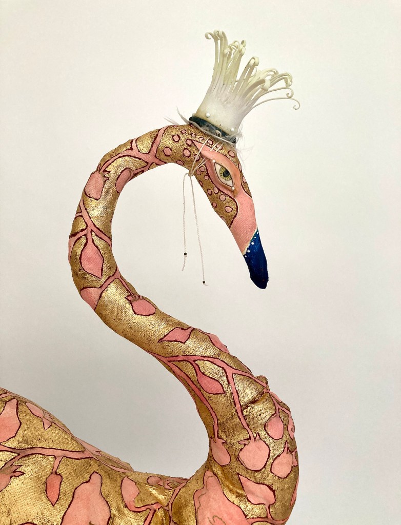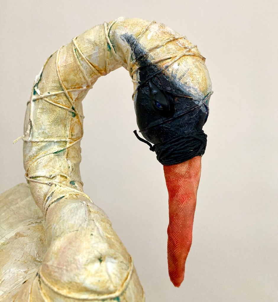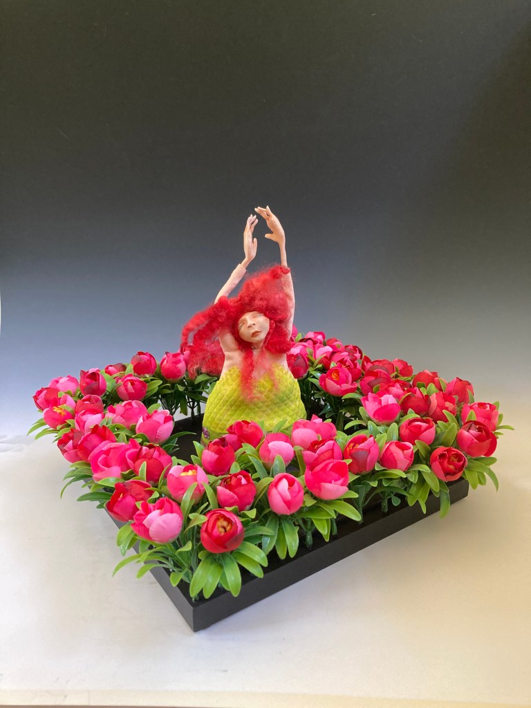 My figurative work is a combination of different materials and methods. I use polymer clay which I colour with pigments and inks. The bodies are built using wire armature then covered or dressed with cloth which may also be at times painted. The bases are found objects or wooden forms I have designed and painted.